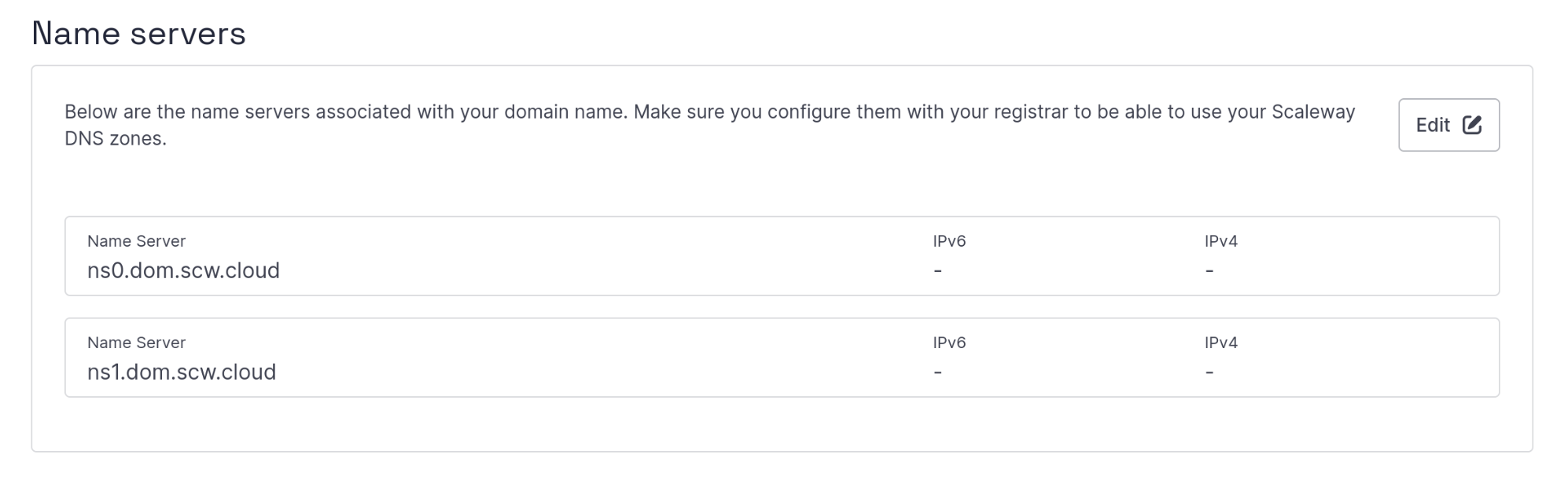 La dernière étape consiste à modifier les serveurs de noms (NS) pour utiliser ceux de Scaleway. Une fois cette modification propagée, Scaleway prendra le relais pour la gestion de votre nom de domaine.